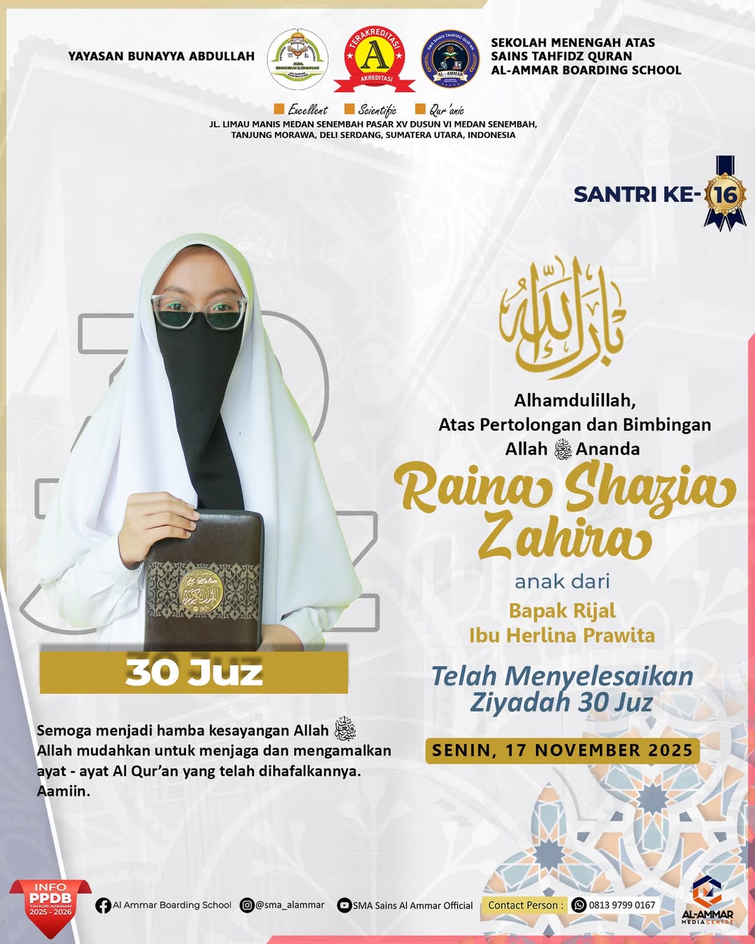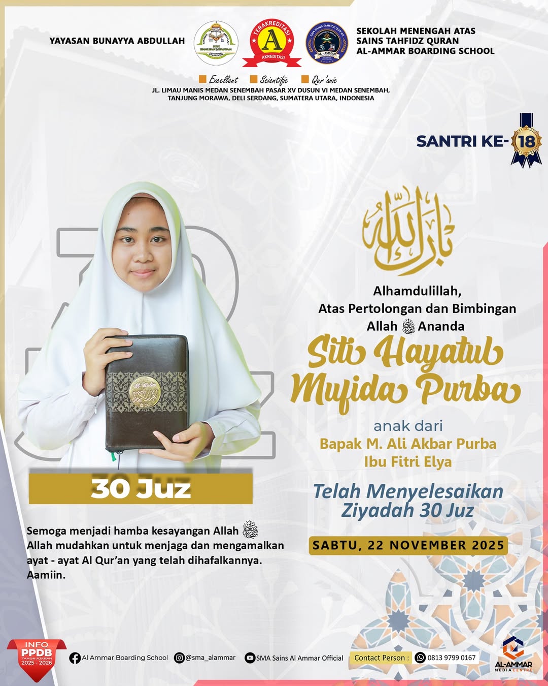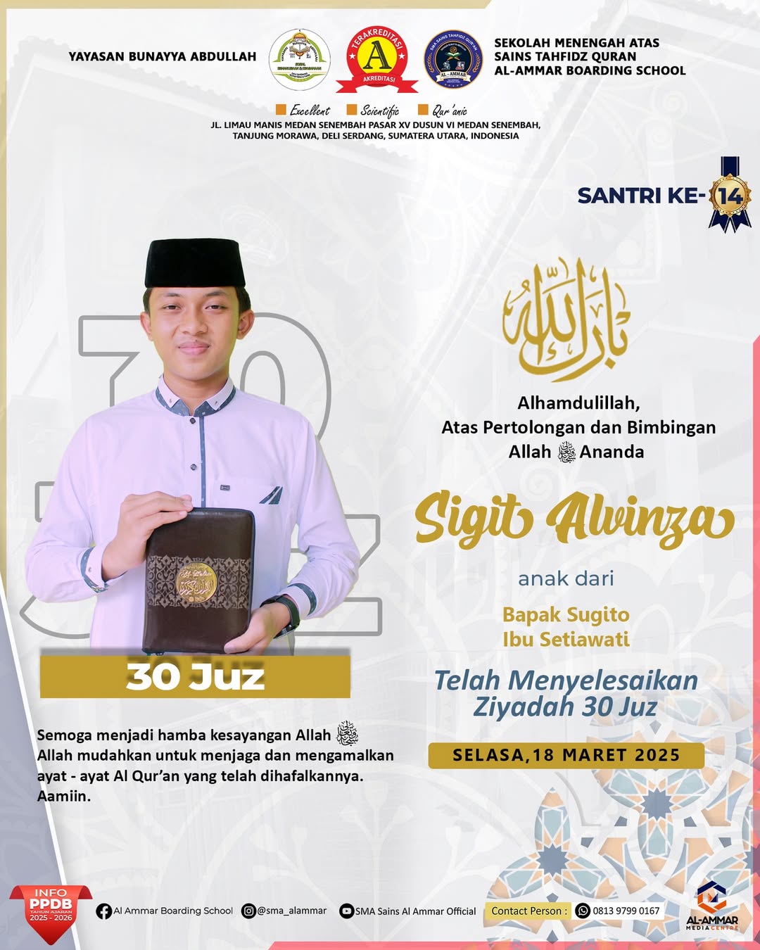 Tahniah wa Barakallah Selamat & Sukses kepada Santri Sekolah Menengah Atas Sains Tahfidz Qur’an Al-Ammar Boarding School Tanjung Morawa, Deli…