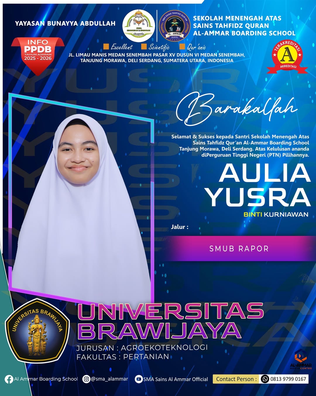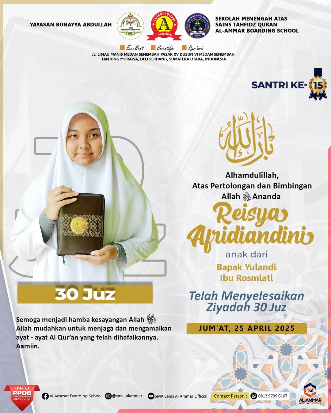 Tahniah wa Barakallah Selamat & Sukses kepada Ananda Aulia Yusra , Santri Sekolah Menengah Atas Sains Tahfidz Qur’an Al-Ammar Boarding…